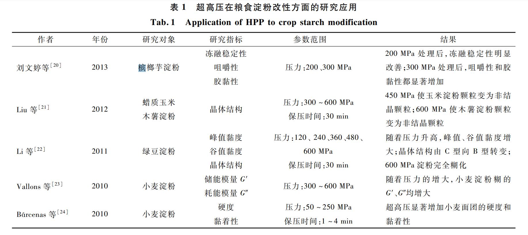淀粉是糧食作物的重要組成部分,在食品工業中是一種重要的食品原料。然而未經改性的淀粉糊化特性和回生特性等易受到溫度和 pH值等因素的影響,限制了淀粉在食品工業中的進一步開發與利用。改性淀粉在一定程度上彌補了天然淀粉乳化能力低、水溶性差等缺點,使其在食品工業中得到更廣泛的應用。超高壓在淀粉改性方面的研究主要是針對淀粉的糊化和回生特性。
