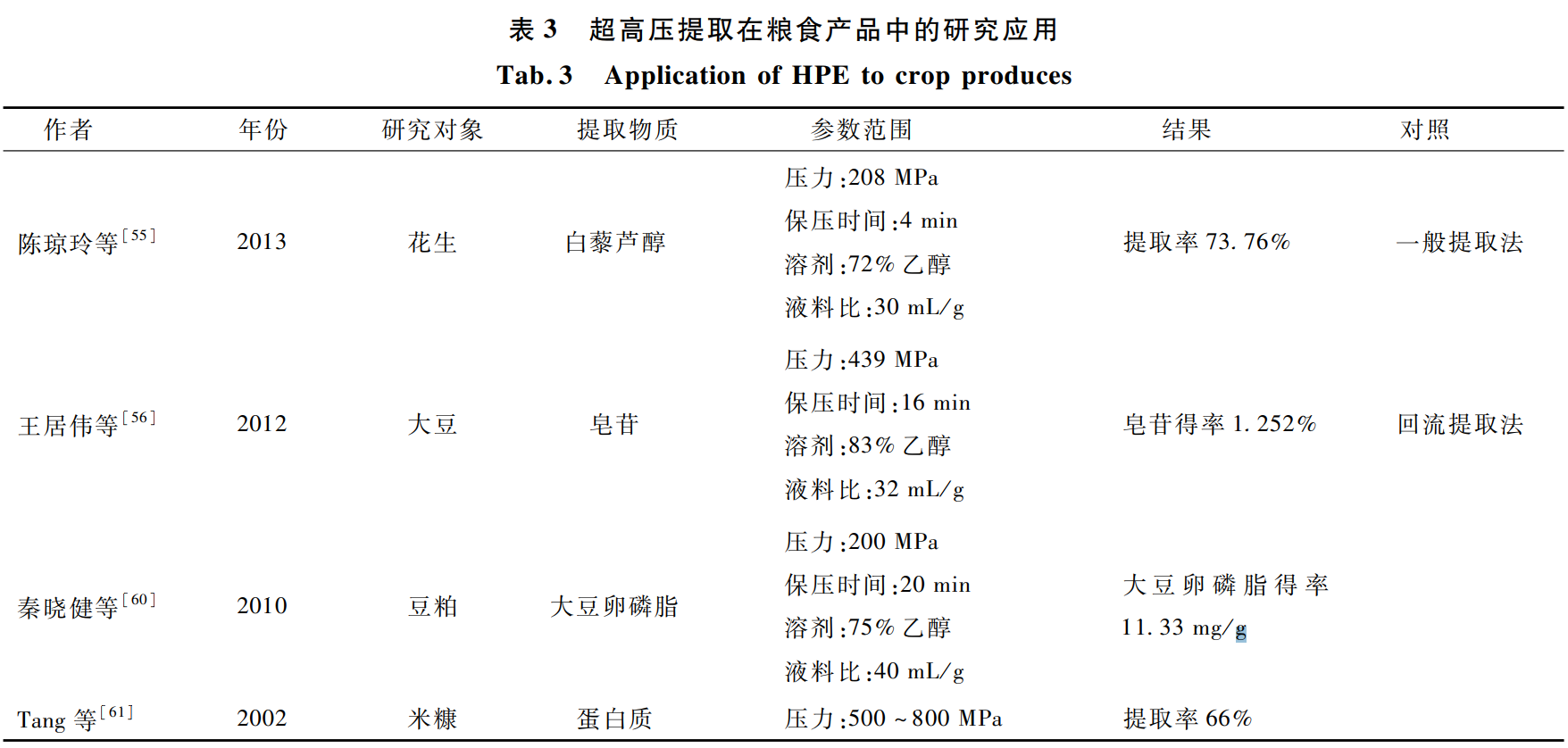 其他學者的相關研究情況見表 3。從目前的研 究資料來看,超高壓提取技術應用于糧食中有效成 分提取的相關報道較少,因此急需開展相關的基礎 研究,相應的設備問題、提取工藝參數的協同調整還 需要進一步深入研究。筆者認為這方面應充分利用 超高壓技術在有效成分提取方面的獨特優勢,提高糧食資源的利用率,這將是有效成分提取領域的一 個重要研究方向。