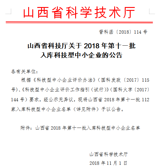 按照《科技型中小企業(yè)評價辦法》(國科發(fā)政〔2017〕115號)和《科技型中小企業(yè)評價工作指引(試行)》(國科火字〔2017〕144號)有關(guān)規(guī)定,山西三水河科技股份有限公司(以下簡稱“三水河”)被認(rèn)定為“省科技型中小企業(yè)”,標(biāo)志著三水河科技創(chuàng)新達到了一個新水平。