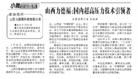 山西力德福科技有限公司為國家高新技術企業、山西省民營科技型企業、山西省“專精特新”企業。該公司定位于科技創新型和生產服務型企業,致力于非熱殺菌保鮮超高壓力生物處理設備的研發、設計、制造,成為繼西班牙、美國公司之后,全球能夠自主開發規模化生產超高壓設備的公司之一。