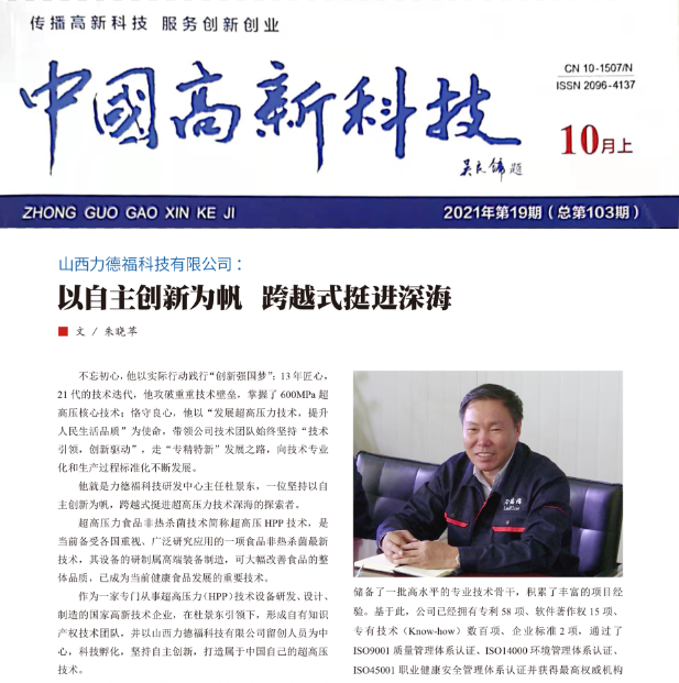 作為一家專門從事超高壓力(HPP)技術設備研發(fā)、設計、制造的國家高新技術企業(yè),在杜景東先生引領下,形成自有知識產(chǎn)權技術團隊,并以山西力德??萍加邢薰玖魟?chuàng)人員為中心,科技孵化,堅持自主創(chuàng)新,打造屬于中國自己的超高壓技術。