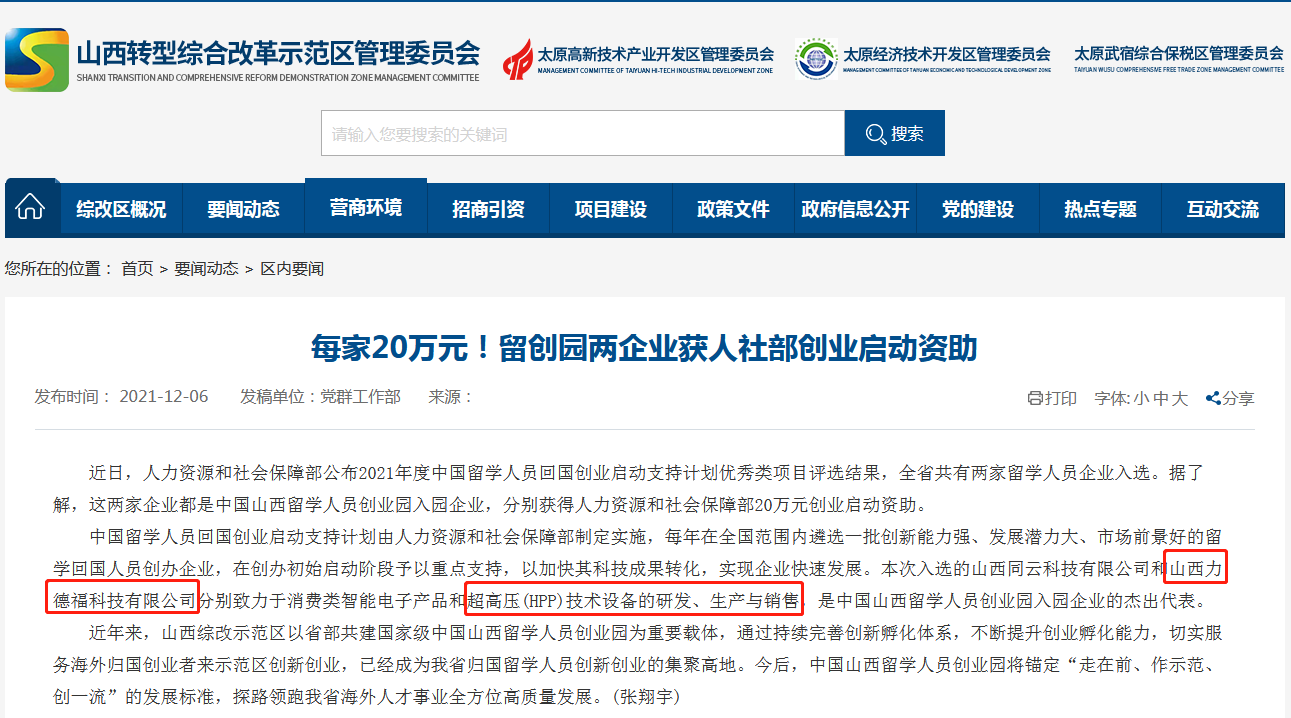 2021年12月,人力資源和社會保障部公布2021年度中國留學人員回國創業啟動支持計劃優秀類項目評選結果,全省共兩家留學人員企業入選。山西力德福科技有限公司作為其一成功入選,并獲得人力資源和社會保障部20萬元創業啟動資助。