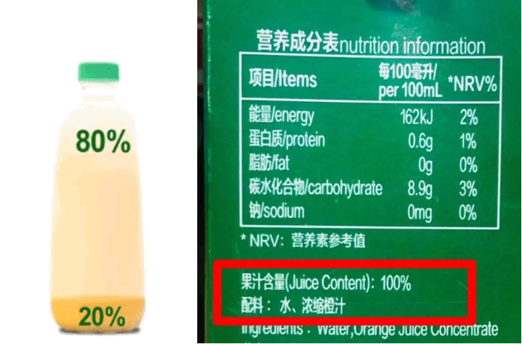 一般情況下FC果汁是由20%的濃縮還原汁+80%的水調配而成。仔細看過配料表就可以發現,這些果汁是由水和水果濃縮汁配比而成的所謂的100%果汁。